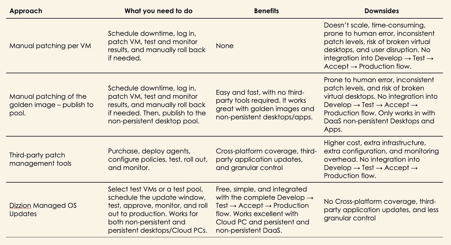 Here’s how Dizzion Managed OS Updates compares to the tools you’re using today for DaaS and Cloud PC?: